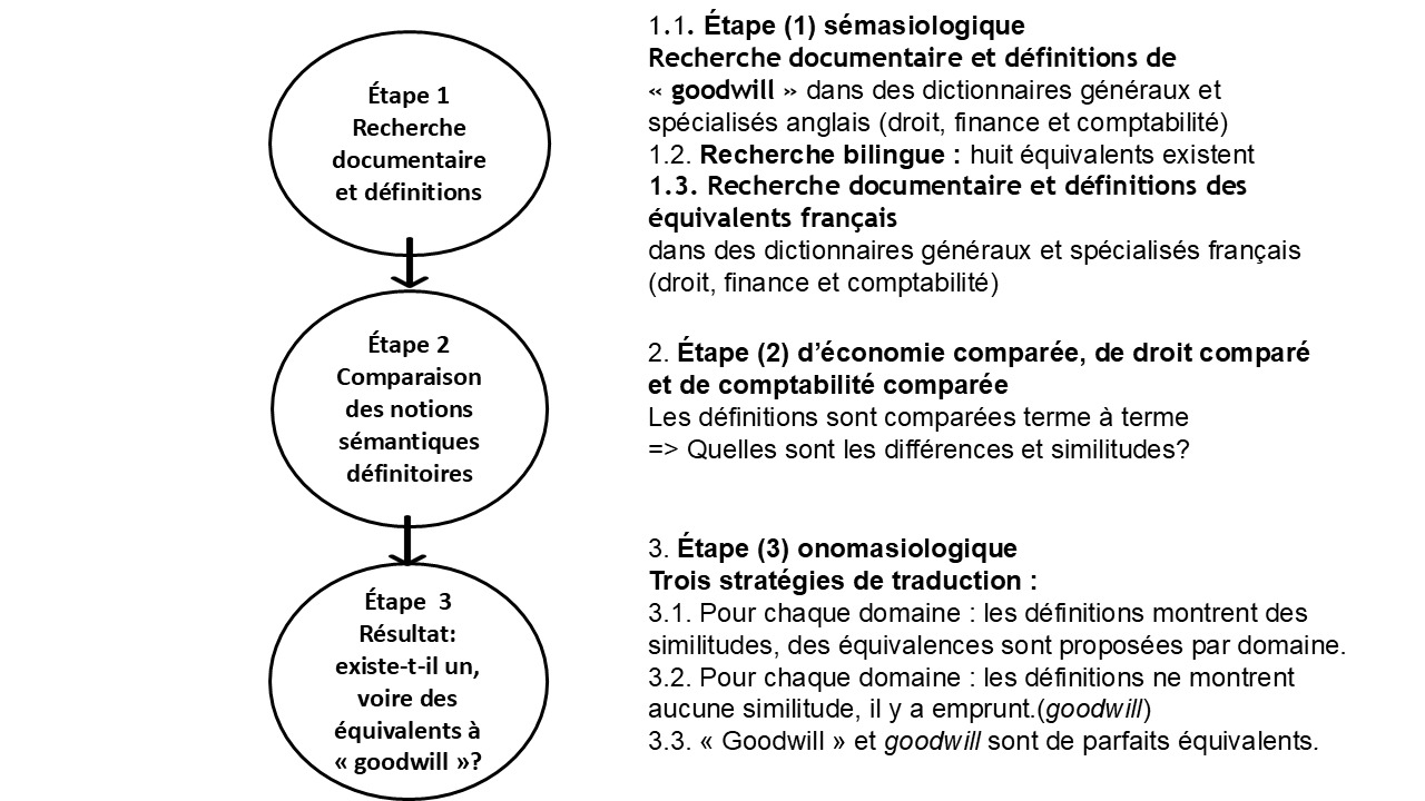 La recherche terminologique contrastive menée repose sur un postulat général : ce qui est comparable est traduisible. Ainsi, seule la comparaison de définitions sémantiquement proches dans les domaines du droit, de la finance et de la comptabilité, en anglais et en français, permet une traduction sémantiquement correcte dans les deux langues. Ce postulat trouve toute sa légitimité dans le cadre méthodologique emprunté à la juritraductologie pour cette étude de « goodwill », à savoir l’approche juritraductologique en trois étapes[7] initialement développée dans le domaine juridique et adaptée à notre étude. La démonstration juritraductologique appliquée à l’étude juridique, financière et comptable comparée porte le nom d’« étude éconotraductologique » et va suivre le même mode opératoire en trois étapes (Fig. 1) :