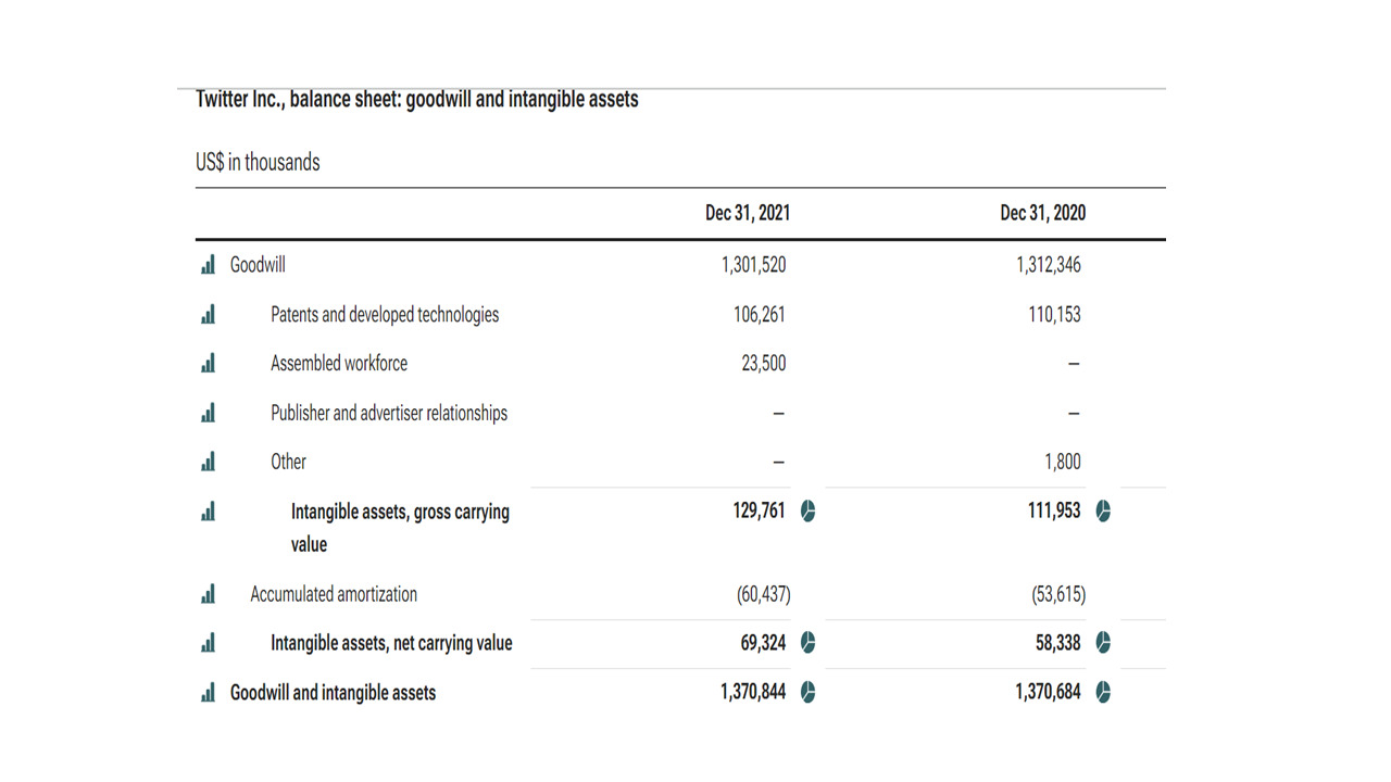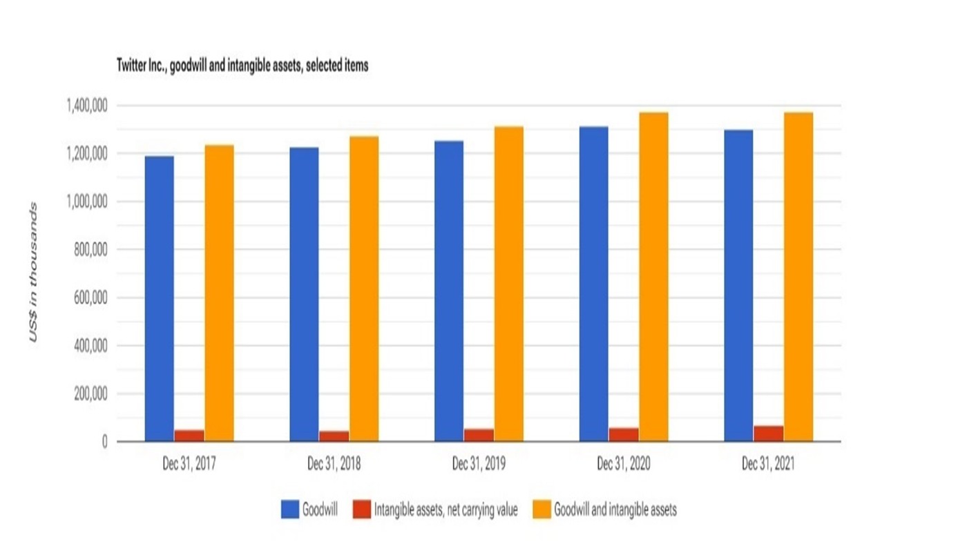 (3) Twitter Inc. goodwill increased from 2019 to 2020 but then decreased slightly from 2020 to 2021[38]. [Le « goodwill » de Twitter Inc. a augmenté entre 2019 et 2020, mais a ensuite légèrement baissé entre 2020 à 2021].