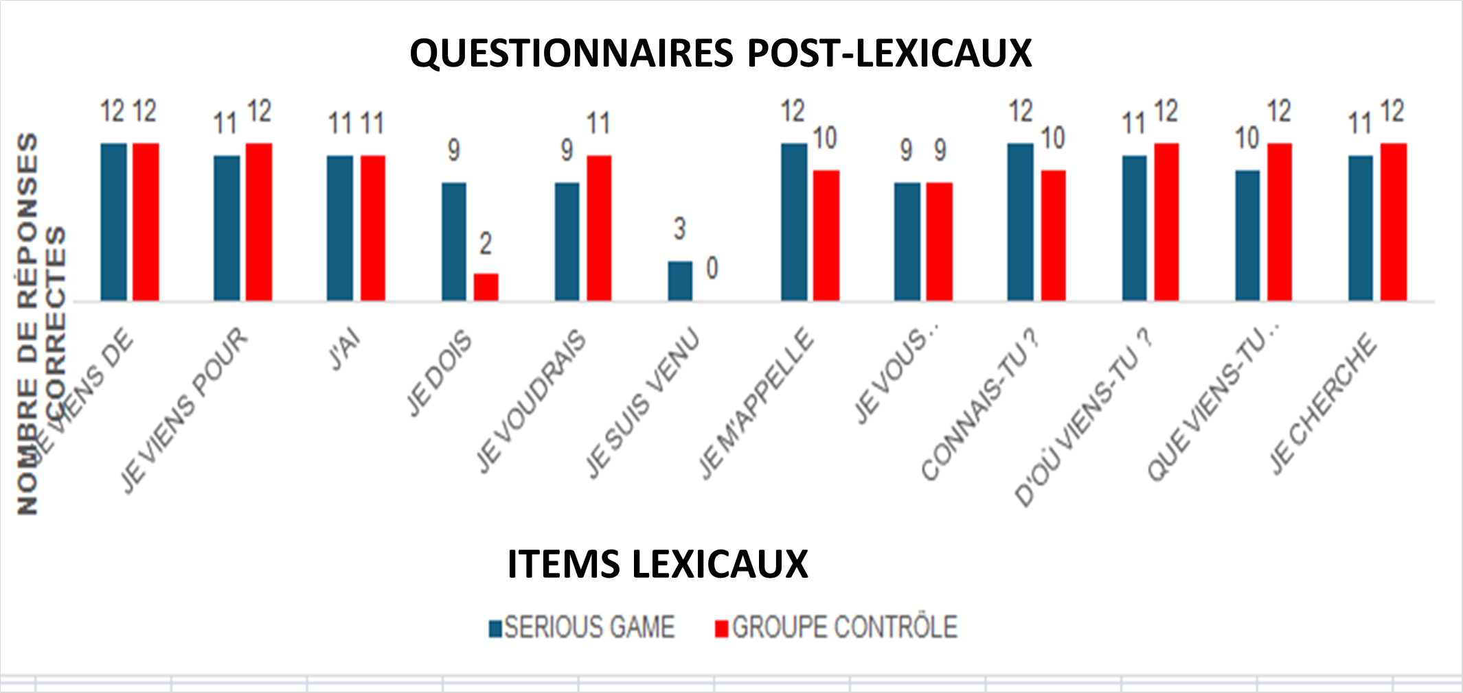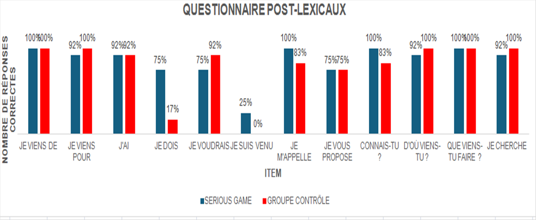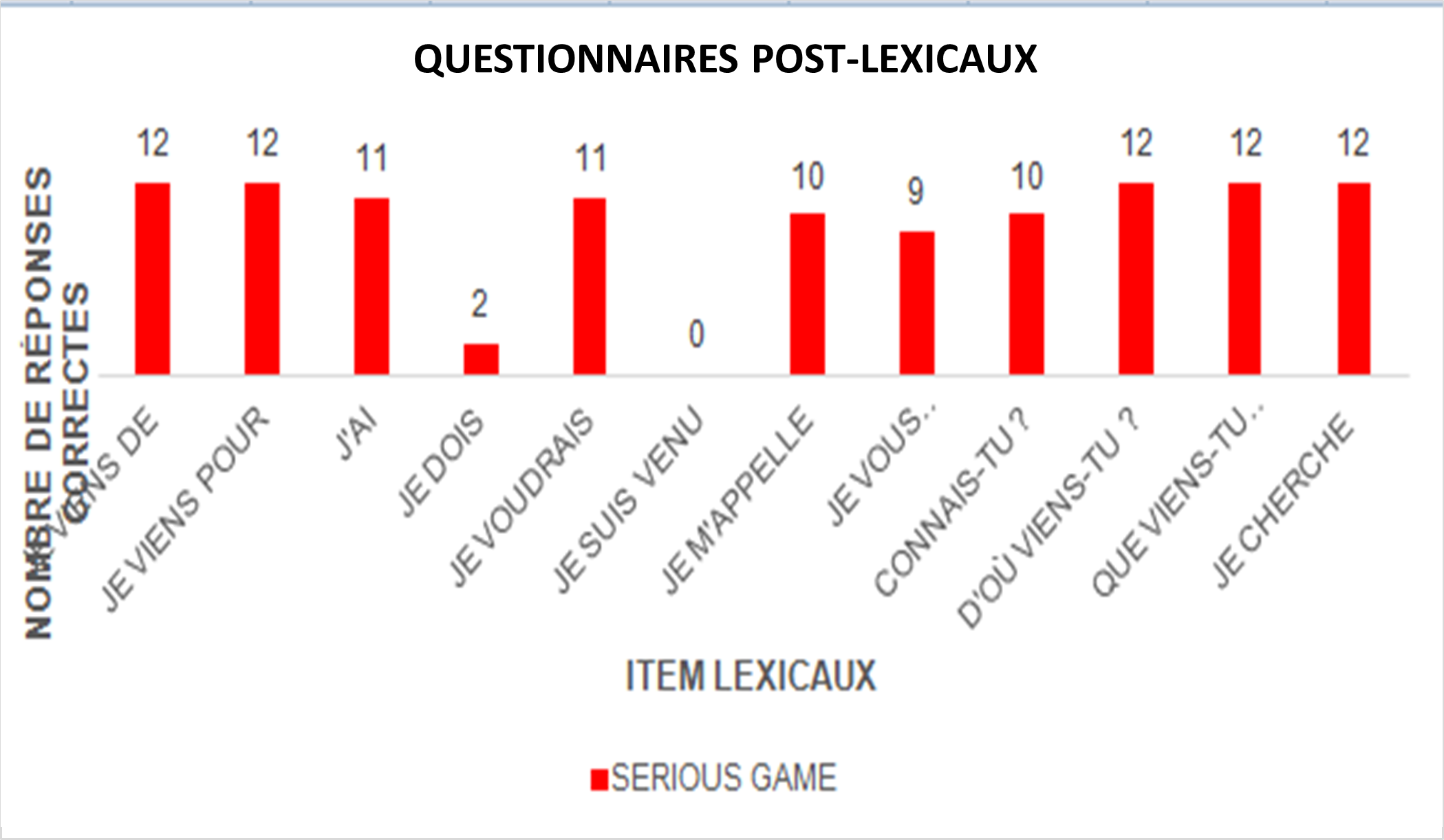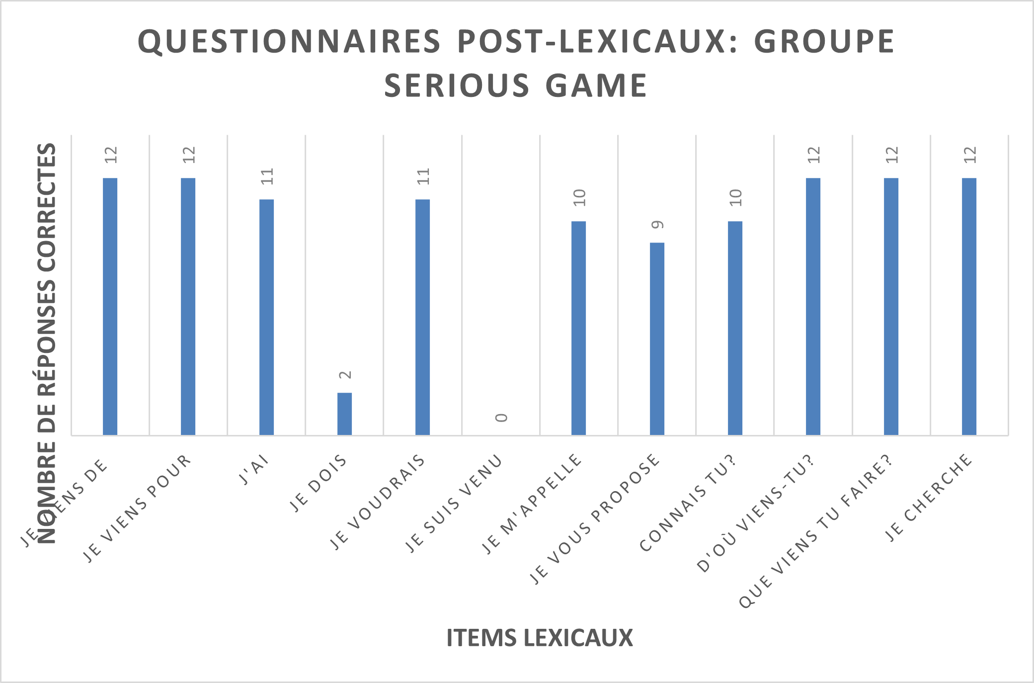 Graphique 2. Résultats des questionnaires post-lexicaux du groupe serious game. Graphique réalisé par nos soins.